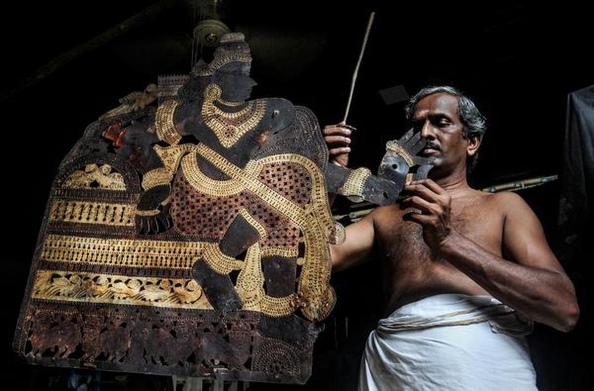 Leather art: Tholpavakoothu artist K. Lakshmana Pulavar chipping leather for making puppets at a workshop at Koonathara, near Palakkad, in Kerala. The figures are drawn on the leather, cut out and embellished with dots, lines and holes.
